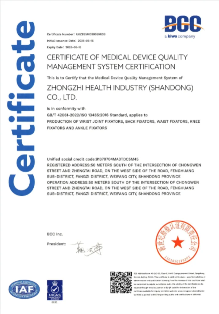 We are Shandong Zhongzhi Health (part of Hangzhou Zhongzhi Group), your manufacturing partner in China, founded in 2020. We produce custom protective gear for sports, health, and medical brands. You get a direct manufacturing line for your products, supported by our free design drafts and reliable quality control. We help you serve your market confidently, backing your products with CE, ISO13485, and BSCI certifications.